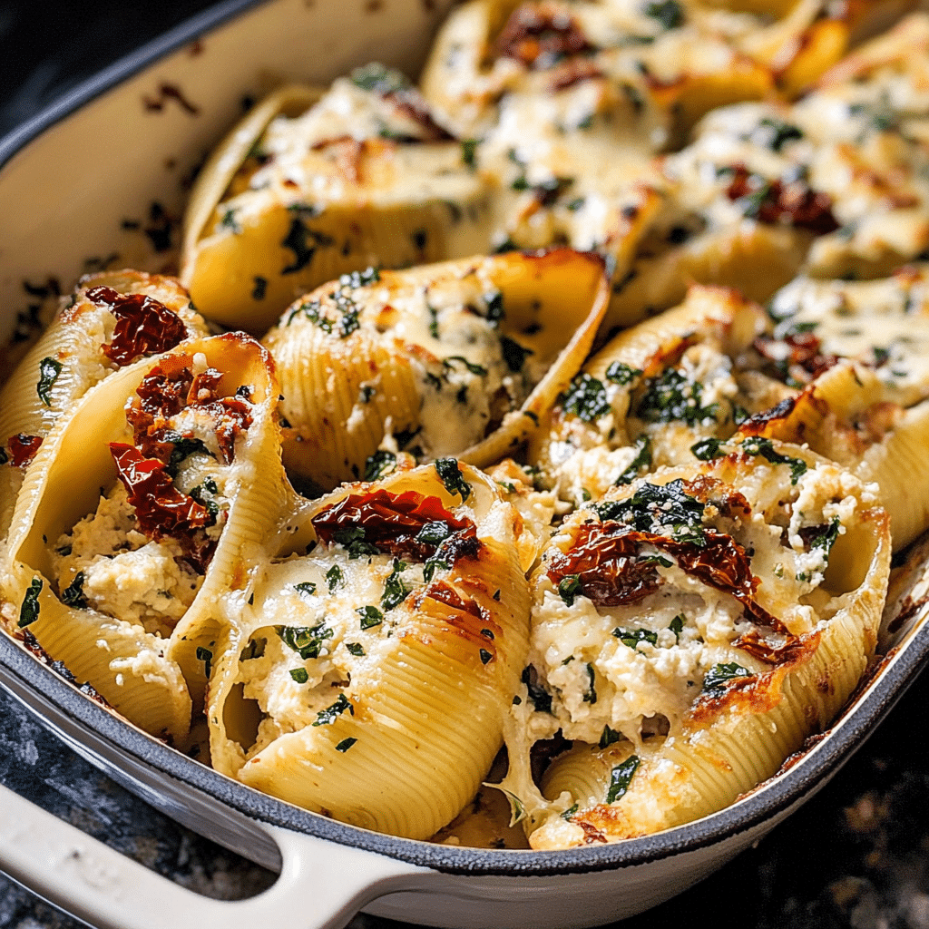 Creamy Sun-Dried Tomato and Ricotta Stuffed Shells is the ultimate comfort dish that combines rich flavors with a satisfying, hearty texture. The tender pasta shells are generously filled with a creamy ricotta mixture, perfectly balanced by the tangy sweetness of sun-dried tomatoes and the aromatic depth of garlic and herbs.
