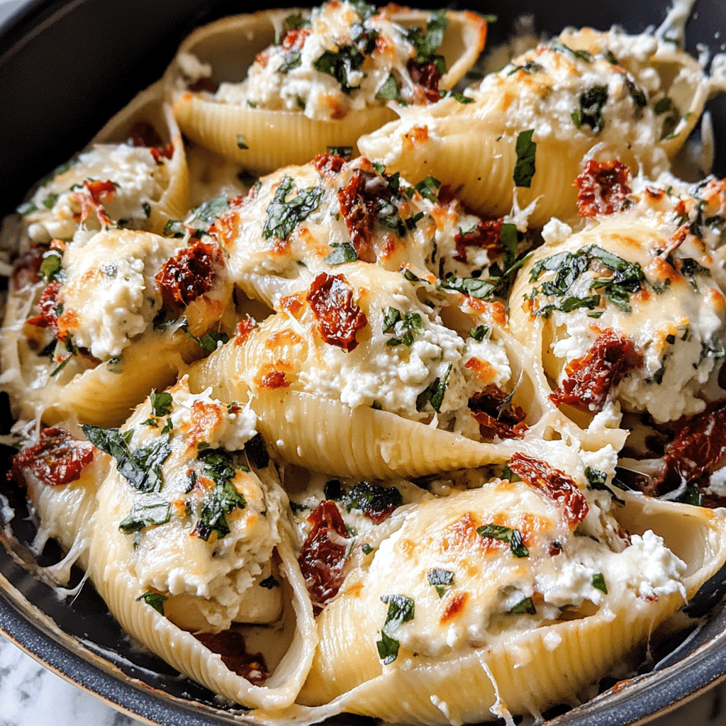 Creamy Sun-Dried Tomato and Ricotta Stuffed Shells are a comforting, flavor-packed dish that combines the richness of creamy ricotta with the tangy sweetness of sun-dried tomatoes, all nestled in tender pasta shells and baked to perfection. This recipe is a perfect harmony of flavors, textures, and cozy vibes, making it a fantastic choice for weeknight dinners or special gatherings. The creamy ricotta filling, infused with garlic, herbs, and the bold punch of sun-dried tomatoes, is elevated further by a luscious marinara sauce and a golden, bubbly layer of melted cheese.