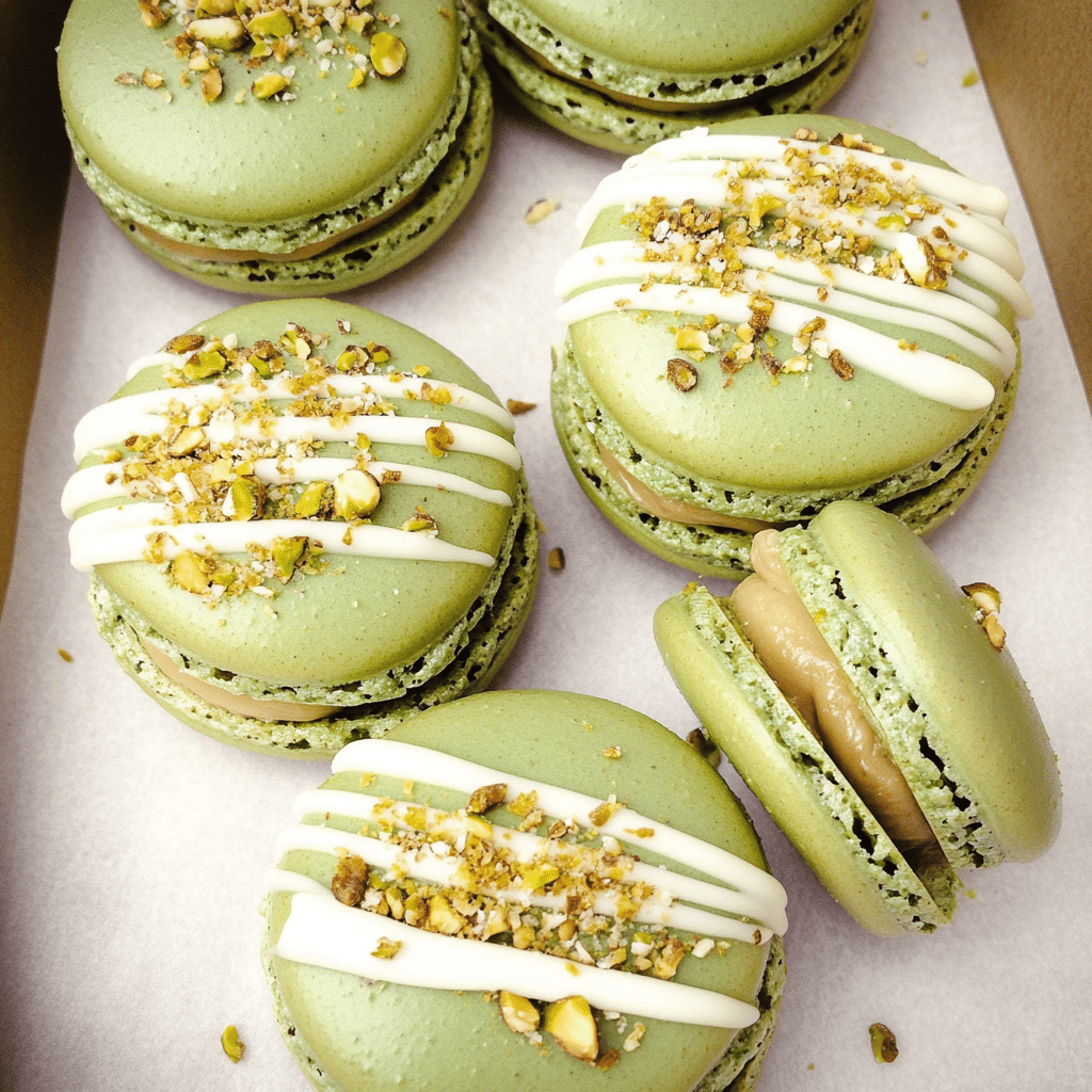 - Refined Flavor Profile: The pistachio-infused shells create a unique flavor that sets these macaroons apart from traditional ones, giving them a nutty richness balanced by the creamy sweetness of the white chocolate ganache.